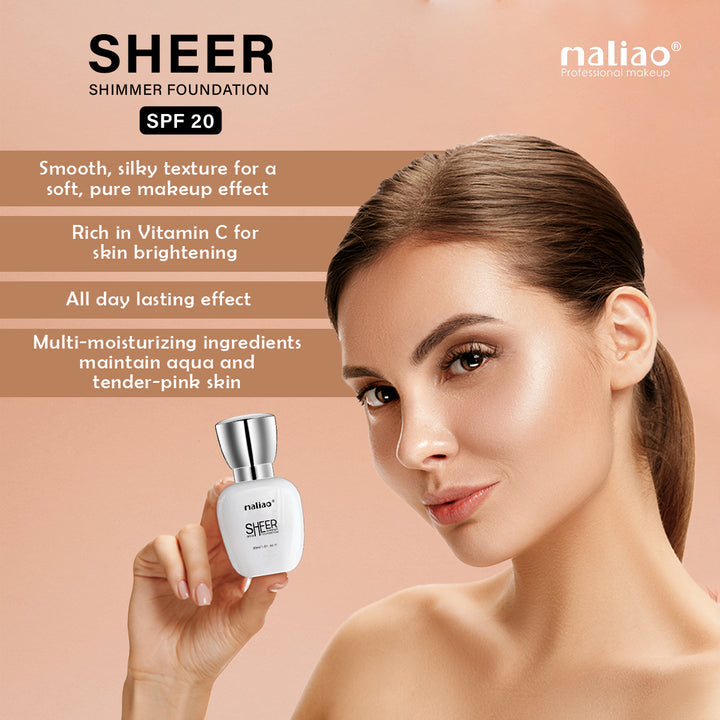 Upgrade your beauty routine with Maliao Sheer Shimmer Foundation SPF 20, designed to provide a luminous, natural finish to facial makeup. This foundation has a lightweight formula that feels comfortable on your skin, providing buildable, long-lasting coverage to even out your skin tone and flatter your complexion. With SPF 20 protection, this foundation protects your skin from harmful UV rays, ensuring you stay protected all day long. Hydrating ingredients keep your skin moisturized, making it smooth and soft. Perfect for all skin types, Maliao Sheer Shimmer Foundation is your go-to choice for a flawless, glowing look.