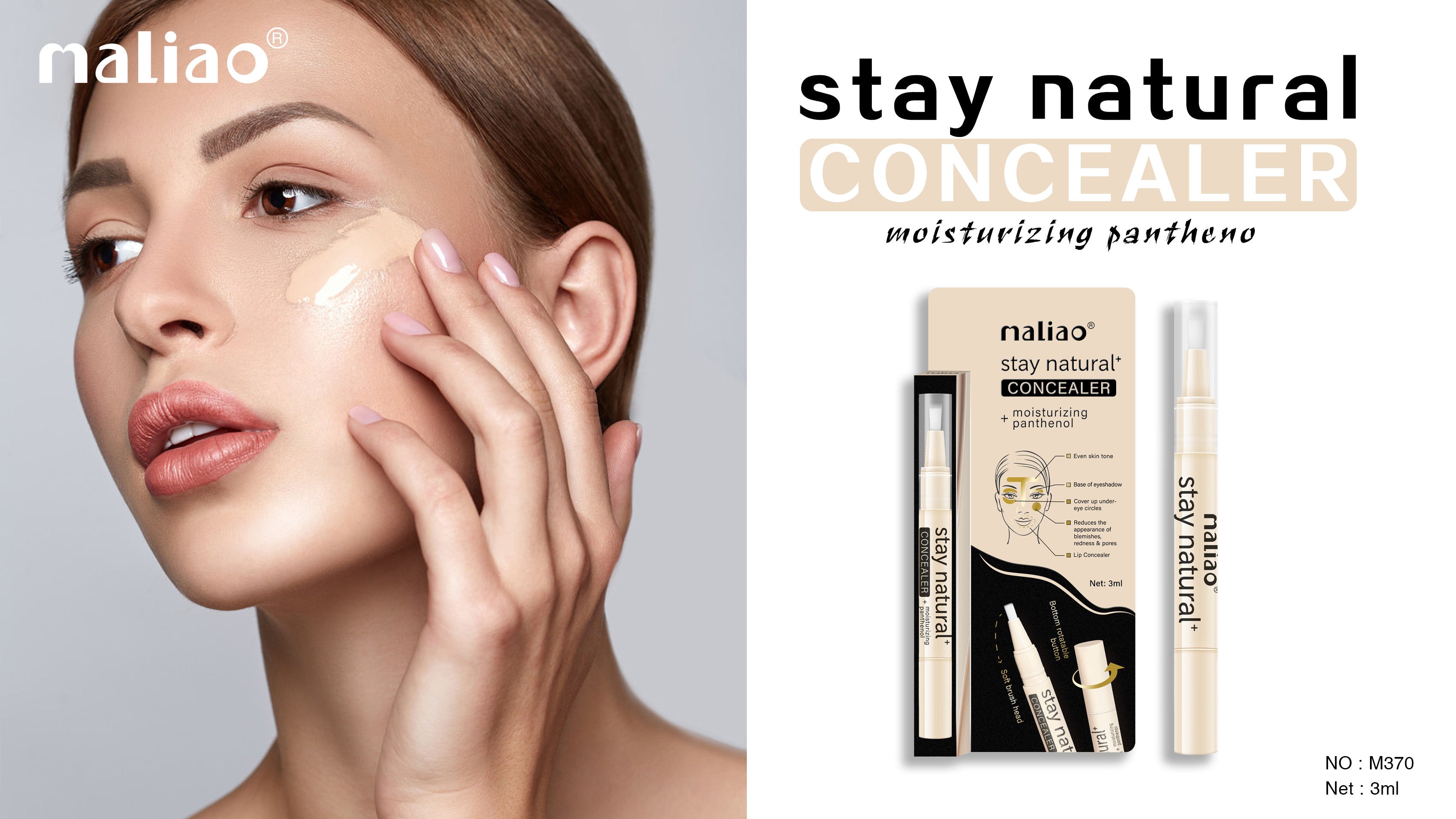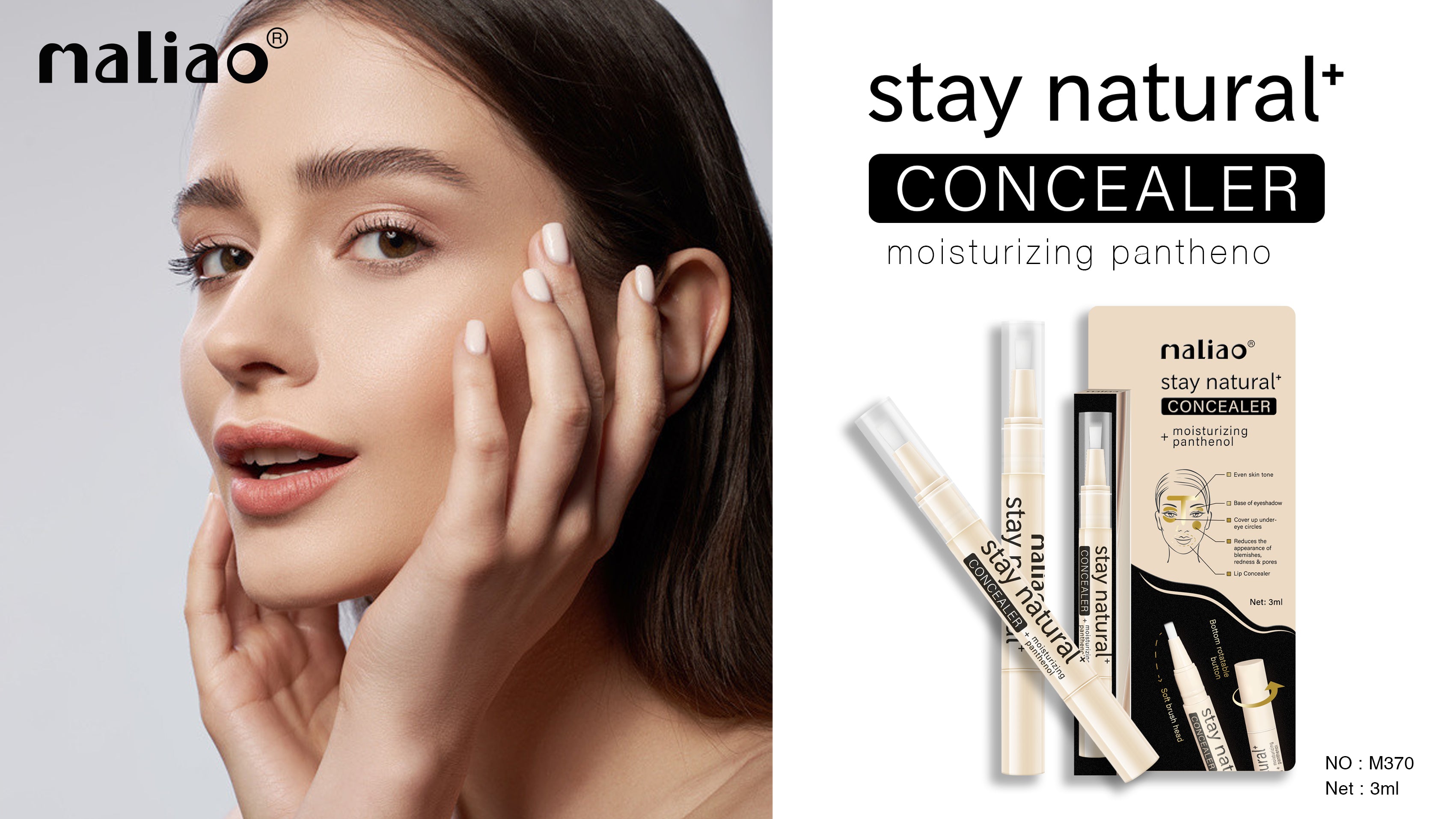 Maliao Stay Natural Moisturizing Concealer is a lightweight liquid concealer enriched with moisturizing panthenol, offering full yet natural-looking coverage. It blends seamlessly for long-lasting comfort and is suitable for all skin types and tones.